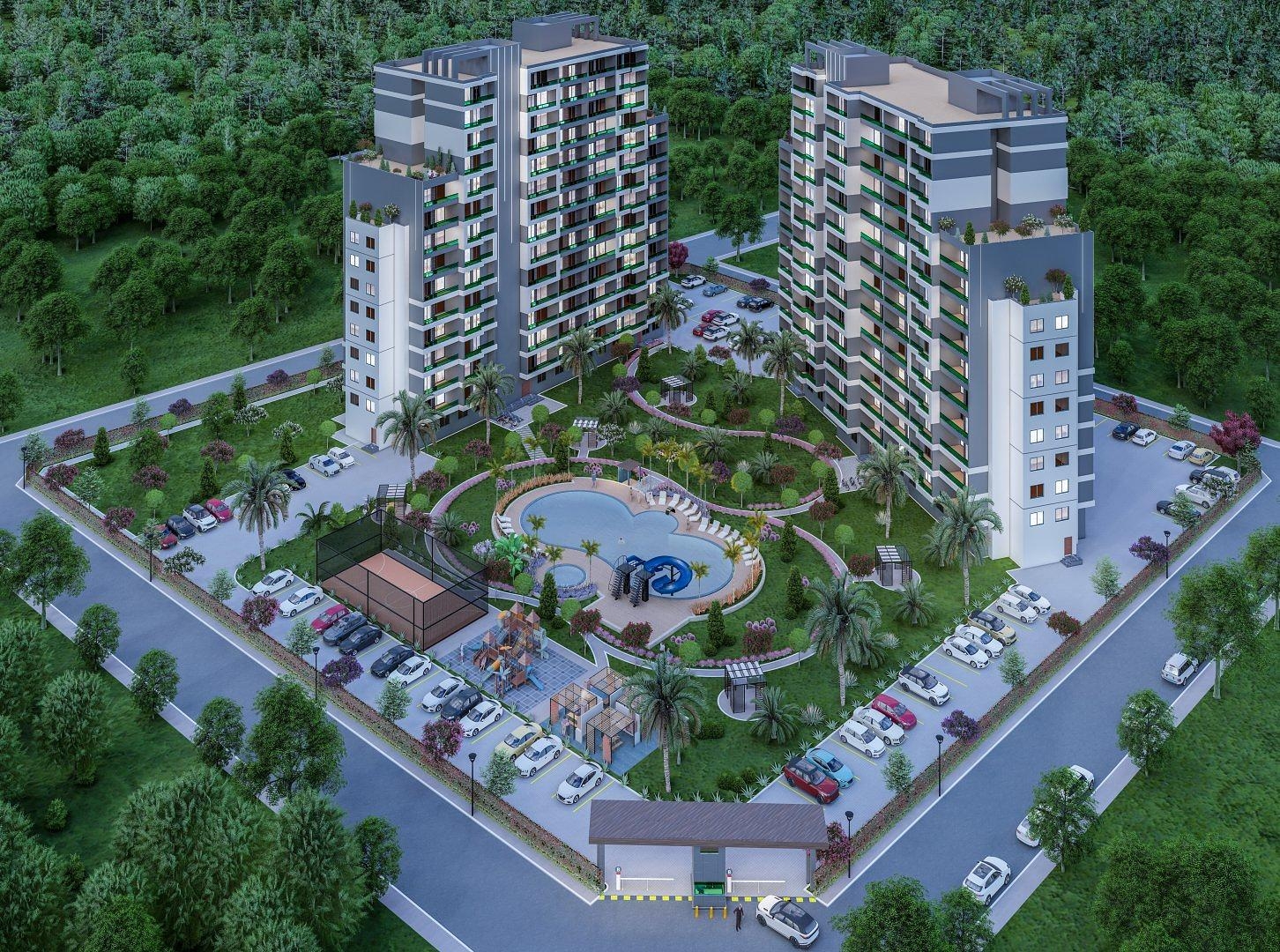يتكون هذا المشروع المصمم جيدًا من كتلتين كبيرتين داخل أراضي واسعة. في أعلى نقطة لها ، يبلغ ارتفاع الكتل ثلاثة عشر طابقًا على الرغم من أن الترتيب المتدرج للطوابق العليا ، والتي تشمل تراسات على السطح ، توفر اهتمامًا معماريًا بالإضافة إلى مناظر خلابة. الشقق من غرفة نوم واحدة مع حمام واحد وشرفة واحدة أو غرفتين نوم مع حمامين وشرفتين. تتميز التصميمات الداخلية الأنيقة بمطبخ عصري مدمج وتصميم غرفة معيشة مع مواد عالية الجودة في جميع الأنحاء. من شرفاتهم ذات الواجهة الزجاجية ، ينظر السكان إلى الأرض. في حين أن المسبح الكبير المزود بزلاجة مائية هو السمة المركزية ، فإن منطقة الحديقة ذات المقاعد الوفيرة توفر مساحة كبيرة للتواصل الاجتماعي. تشمل المرافق حمامًا تركيًا وساونا لمن يبحثون عن الاسترخاء حقًا.