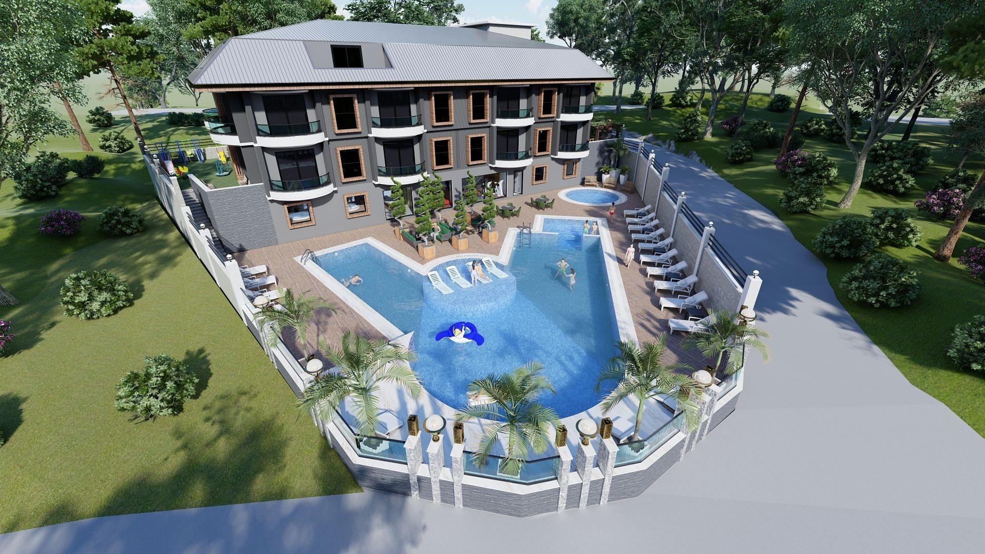 Kompleks nekretnina sastoji se od jedne dvospratne zgrade unutar ograđenog terena sa velikim otvorenim bazenom sa obilnim prostorima za sunčanje i sjedenje. Jednosoban stan ima jedno kupatilo i jedan balkon. Četvorosoban stan je dupleks koji ima tri kupatila i dva balkona. U skladu sa modernim trendovima dizajna, svi apartmani imaju prostranu kombinovanu kuhinju i dnevni boravak. Sadržaji uključuju dobro opremljenu teretanu i spa kvalitetno tursko kupatilo, saunu i jacuzzi.