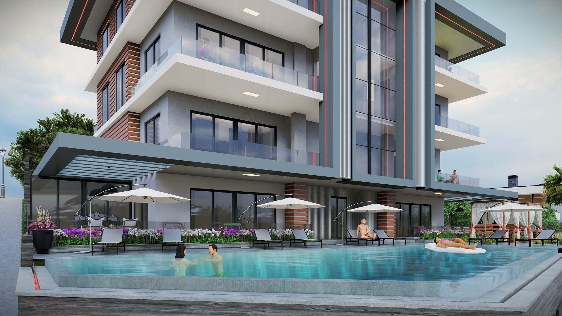 Dette smukke nye kompleks har en slank, moderne arkitektur med en blanding af beton, glas og metaldetaljer, hvilket gør det til en smuk bygning. Lavbygget, det passer smukt ind i dette rolige boligområde. Med kun seks smukt udformede lejligheder fordelt på fem etager, vil dette fantastiske projekt appellere til dem, der leder efter et stort sommerhus eller permanent bolig. Stueetagen er hjemsted for to have-duplexer med fire soveværelser; på de næste etager er en række tre-værelses lejligheder og fem-værelses duplex. Dette projekt er designet til at appellere til familier, der leder efter et elite- og prestigefyldt hjem med moderne inventar og inventar. Hver smukt designede lejlighed er lyse og luftige med store vinduer og døre, der fører ud til balkoner med glasfront. De åbne køkkener har rigeligt med skabe og arbejdsplads, og badeværelserne er smarte og funktionelle. Forestil dig at solbade omkring en smuk pool og slappe af under det varme middelhavssolskin. Senere vandrer du ind til byen for at få et glas vin i en af de smarte barer med udsigt over slottet. Der ser du den herlige solnedgang over Taurusbjergene. Dette er det liv, du fortjener - afslappende og foryngende.