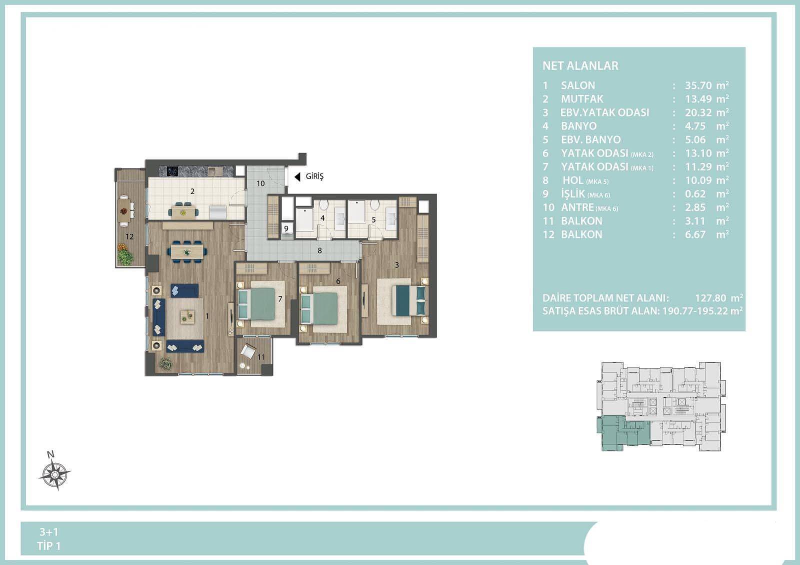 Der er fire blokke i forskellige størrelser, som udgør dette kompleks. Den højeste blok er på 25 etager. Lejlighedernes størrelse spænder fra et soveværelse med et badeværelse op til fire soveværelser med tre badeværelser. Det elegante stilfulde interiør har træ og fliser af høj kvalitet. Alle lejligheder har én balkon, hvorfra man kan nyde den fantastiske udsigt over byen eller den omkringliggende natur. Det smukke haveområde er godt anlagt, med gangbroer og siddepladser. Tyrkisk statsborgerskab opnås med ejerskab af en lejlighed.