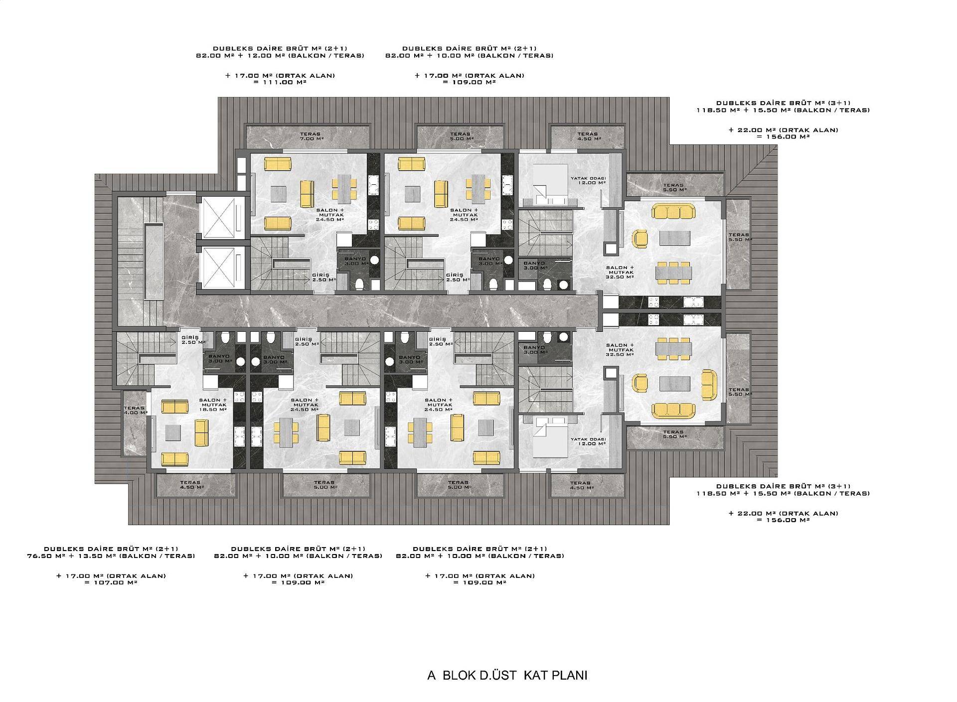Fordi projektet er placeret på en bakke, giver alle vinduer en fantastisk udsigt over Middelhavet, Tauros-bjergene og frodige grønne områder. En stor bonus for dette projekt er også, at hver lejlighed får sin egen parkeringsplads i den underjordiske garage. Boligen består af 4, fem-etagers bygninger (A blok med 29 lejligheder, BC blok med 24 lejligheder, D blok med 20 lejligheder), to, tre og fire-værelses duplex lejligheder. Den unikke beliggenhed kombineret med høj kvalitet i byggeriet, moderne design og velholdt ledelse vil give de nye boligejere en behagelig livsstil og garantere sikkerheden for din investering.