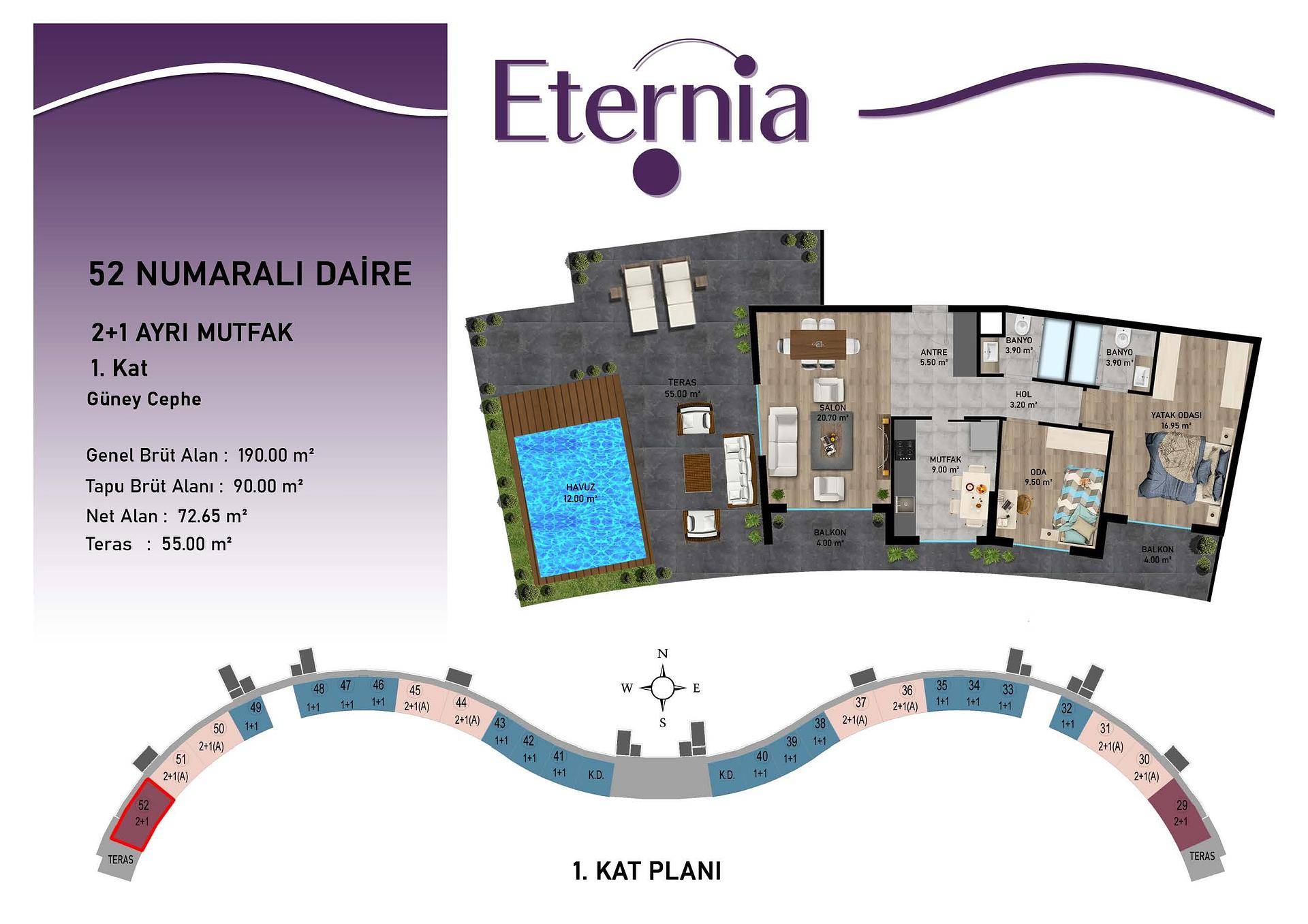 Velkommen til indbegrebet af luksus at bo i Aksu, Antalya, Tyrkiet. Vores seneste projekt omdefinerer overdådighed og præsenterer en uovertruffen fusion af sofistikering og komfort. Med inspiration fra 5-stjernede hotellers overdådige æstetik kan denne udvikling prale af et design, der udstråler elegance og eksklusivitet. Fra det øjeblik, du træder ind i den store lobby, vil du blive fordybet i en verden af luksus. Hver lejlighed i dette værdsatte projekt er omhyggeligt udformet til at tilbyde den største raffinement og bekvemmelighed. Disse boliger afspejler den smarte stil, der minder om Dubai, og har fantastiske arkitektoniske detaljer og moderne finish. Forestil dig at træde ud på din private balkon for at finde en rolig oase - en personlig swimmingpool, hvor du kan slappe af og nyde den betagende udsigt. Men luksus stopper ikke der. Vores lejligheder er omhyggeligt udstyret med state-of-the-art faciliteter, herunder et smart home-system, der giver dig mulighed for nemt at kontrollere dit miljø. Med aircondition inkluderet i prisen, vil du nyde komfort året rundt, uanset vejret. For investorer, der søger mere end blot en ejendom, tilbyder projektet muligheden for at opnå tyrkisk statsborgerskab - en lokkende udsigt med adskillige fordele, og med en lejegaranti på plads, kan du være sikker på, at din investering vil give lukrative afkast. Bekvemt beliggende kun en kort afstand fra det pulserende bycentrum, uberørte strande og Antalya International Airport, denne udvikling sætter alt, hvad du behøver inden for rækkevidde. Uanset om du hengiver dig til en dag med shopping og spisning eller slapper af på sandkysten, vil du opdage, at livet her tilbyder den perfekte balance mellem luksus og bekvemmelighed. Oplev toppen af eksklusivt ophold i Aksu, hvor hver detalje er designet til at overgå dine forventninger og løfte din livsstil. Velkommen hjem til luksus omdefineret.