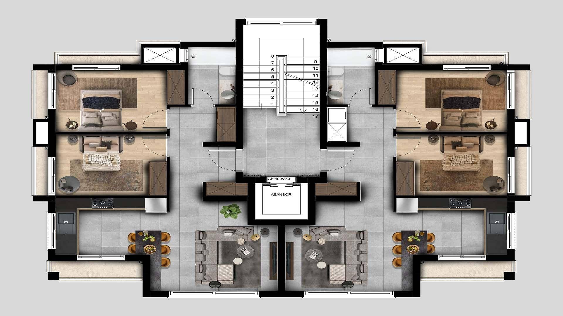 Disse smukke to-værelses lejligheder er beliggende i et af de mest bekvemme områder i Girne, Cypern. Udover at være i hjertet af byens centrum, vil du også være tæt på havneområdet, hvor alle de dejlige kaffebarer og restauranter ligger. Alle lejligheder er mangefacetterede med altaner omkring lejlighederne. Det, der gør disse lejligheder så attraktive, er, at der på hver etage kun vil være 2 lejligheder. Det betyder, at planerne er specielt designet til at bringe komfort til de nye beboere, der flytter ind. Når du går ind mod lejligheden, bliver du mødt af en lang korridor, der enten kan føre dig til soveværelser + badeværelse. Samtidig er der på den anden side stue og åbent køkken, som er opdelt af et smart designet spisebord. Alle altaner og vinduer vil bringe masser af lys ind hele dagen lang takket være gulv-til-loft-designet.
