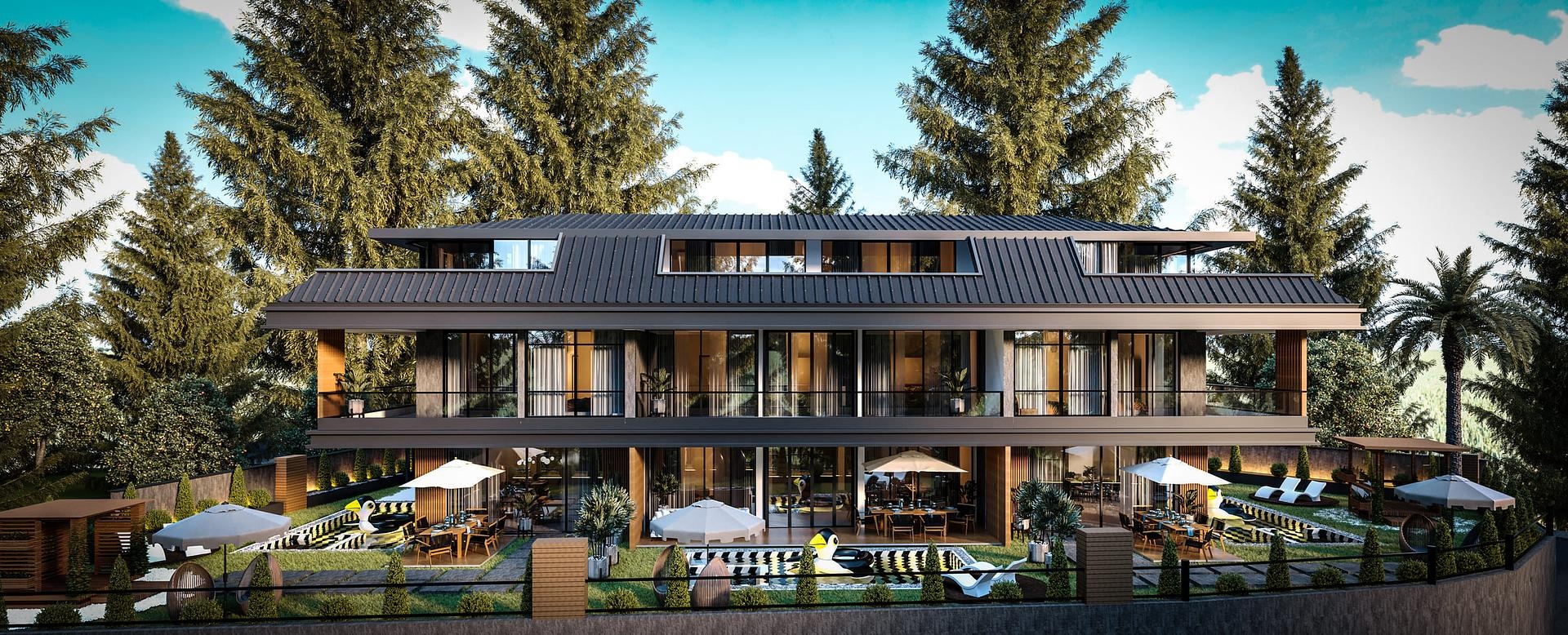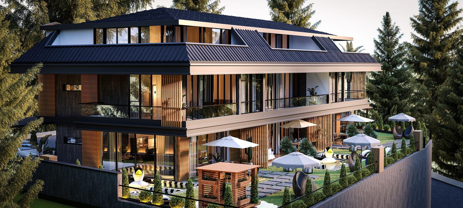 Die Villen sind architektonisch wunderschön, in einem modernen Stil gebaut und verfügen über eine Mischung aus Stein, Holz und Glas.
