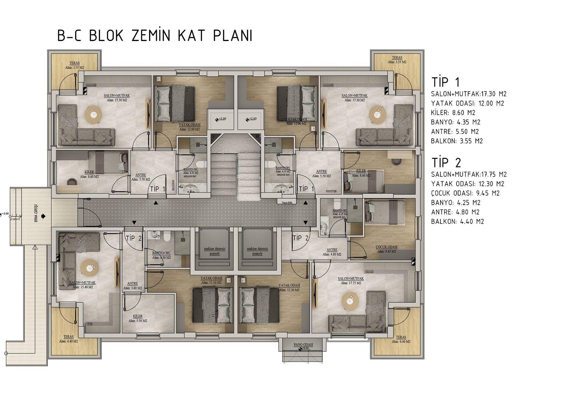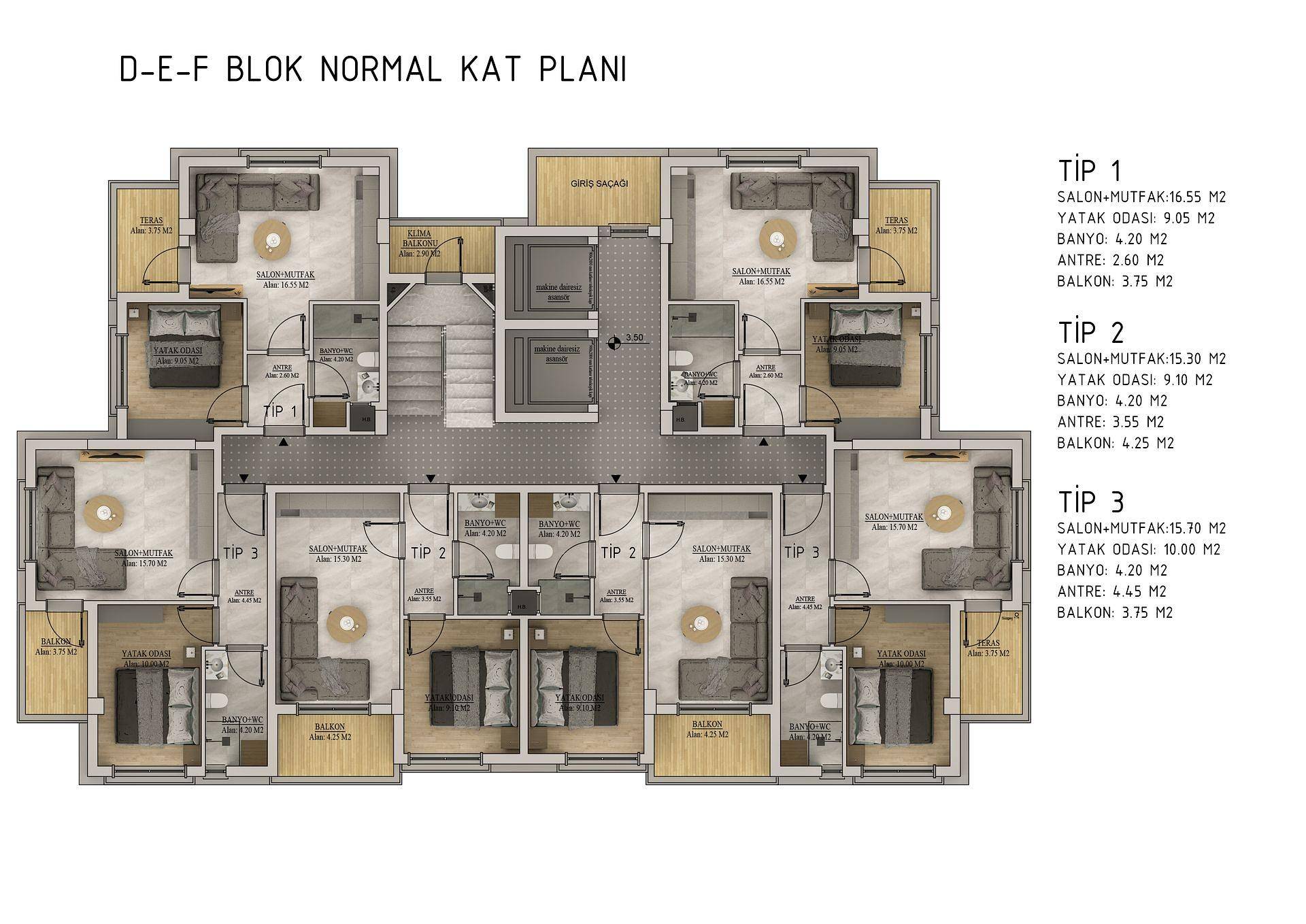 The holiday village-style project is built on a 9.368 m2 plot of land and comprises of 6 buildings with 6 floors and 202 units in 1+1 and 2+1 layout types. The project stands out with a fully equipped social facilities, including olympic-size outdoor swimming pool, aquapark, gym, fitness, sauna, café, tennis court, aquapark, children's playground, and indoor parking lot, and its features inside the apartments open the way to a pleasant and luxurious lifestyle.