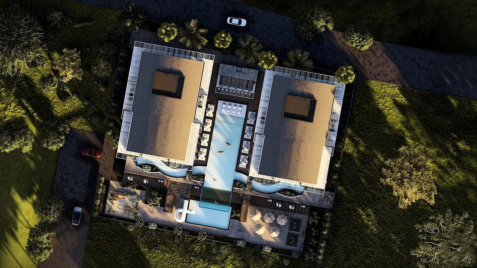 The modern property complex is made up of two four-floored blocks. These blocks are set on pretty grounds where residents can relax, socialize, or admire from their balconies. The apartments are one and two-bedroomed with 1 or 2 bathrooms. In addition to the impressive interior design work, the apartment complex benefits from many facilities. These include a well-equipped gym and spa—an ideal opportunity for individuals, couples, or those with small families.