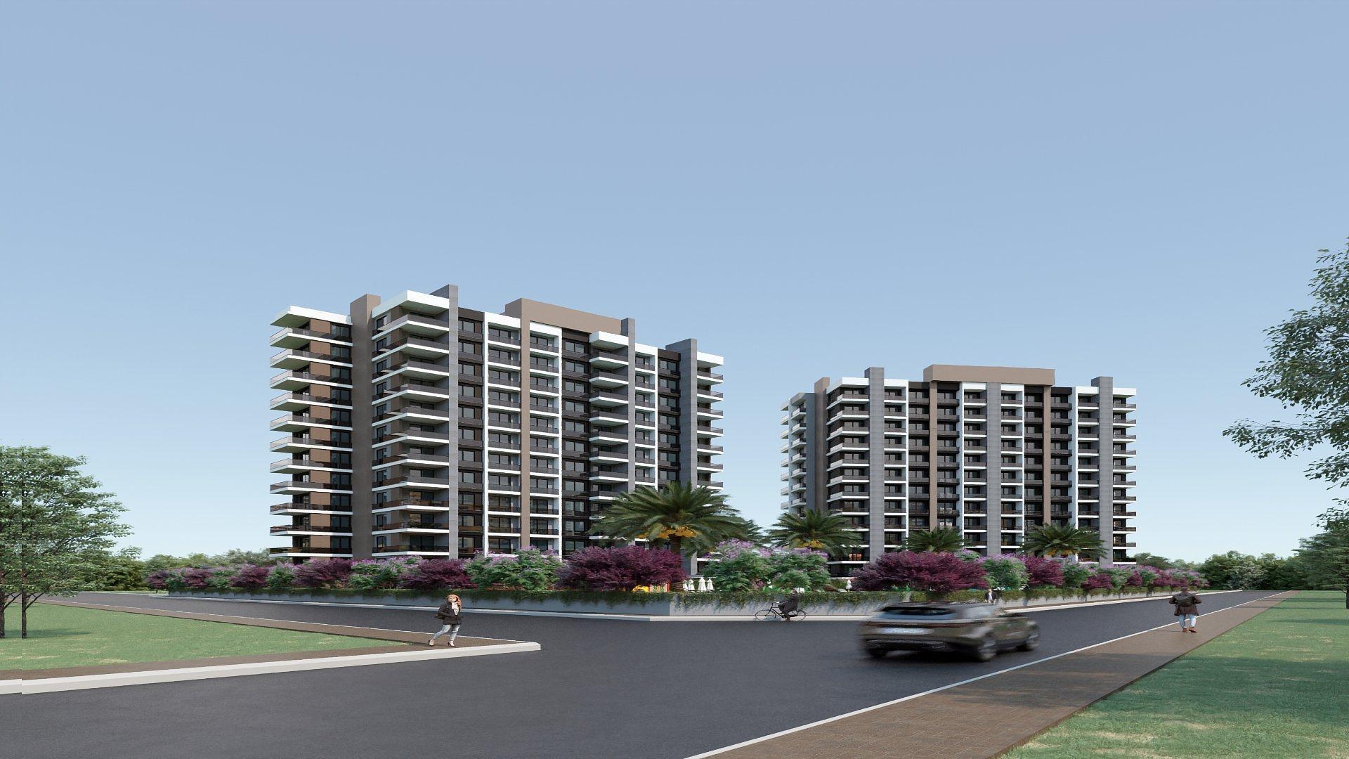 The property comprises two eleven-floored blocks within the grounds, including an outdoor pool with a unique half-moon shape. The apartments are one bedroomed with one bathroom and one balcony. The design ensures the best use of space with a combined living room and kitchen. The soft tones of the interior add to the feeling of light and spaciousness. Facilities include an open car parking and playground.