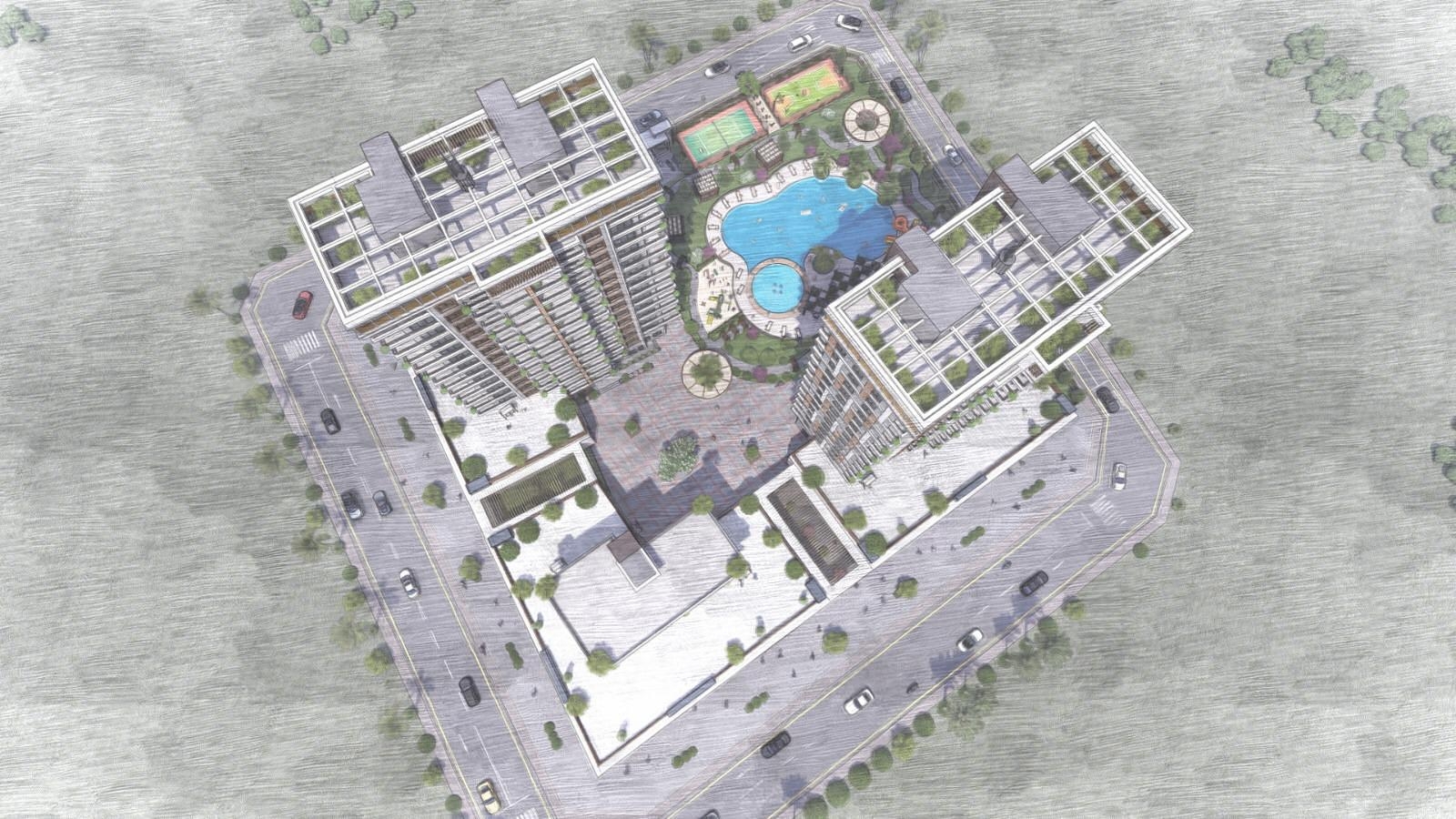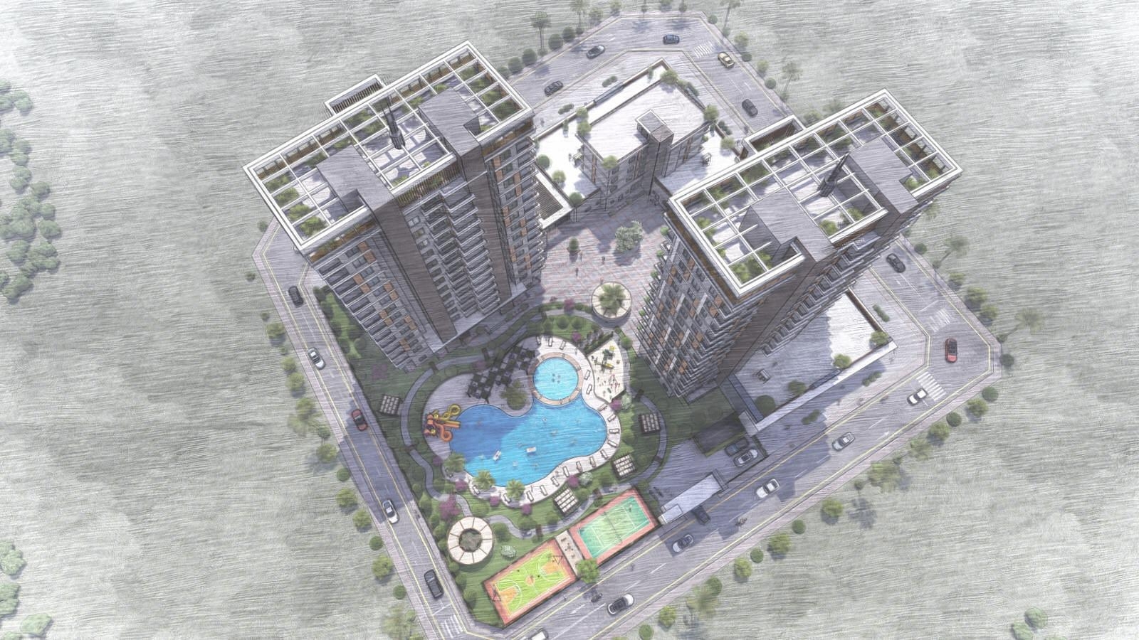 The property complex is made up of 2 blocks that have 13 floors. The two-bedroom apartments and the combined living and kitchen area are spacious and stylish. Each apartment has two deluxe bathrooms in terms of design and quality. From the balcony, residents can enjoy breathtaking sea views or overlook the outdoor pool, which is the main feature of the grounds. Facilities include a Turkish bath and sauna for the adults and a basketball court and playground for the children.