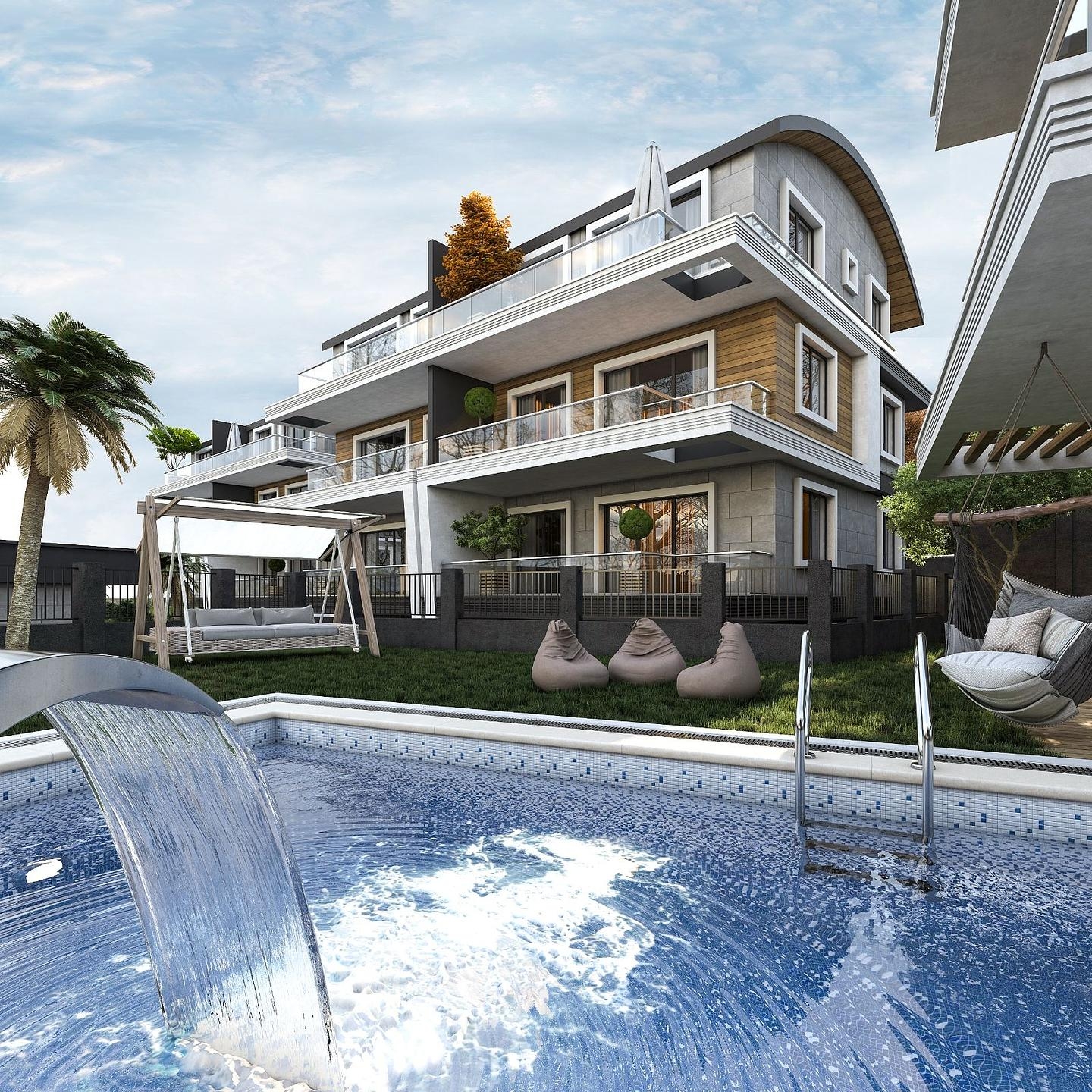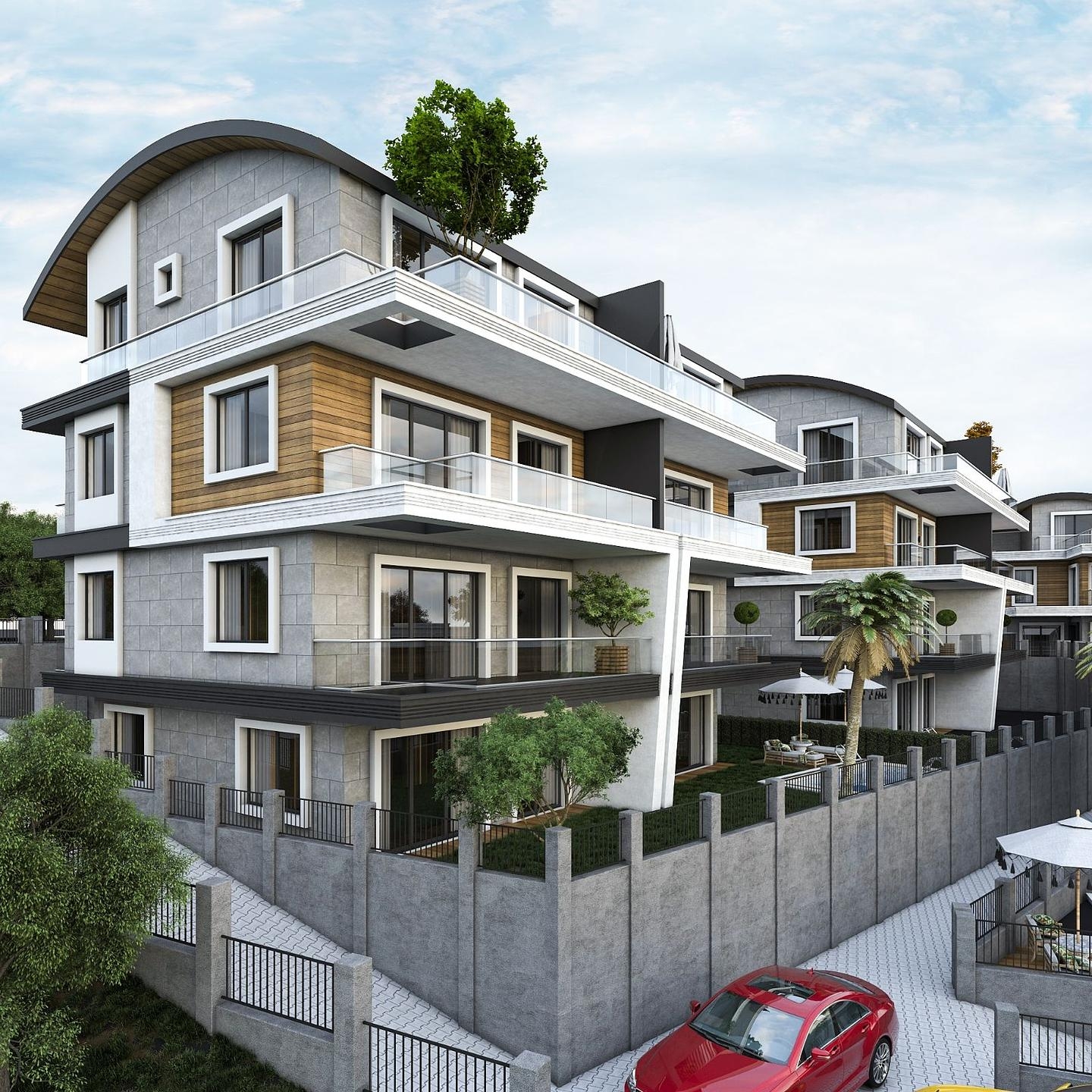 The designer behind this project aims to provide a luxurious and glamorous understanding of living in a fabulous city such as Alanya. Tepe is one of the geographically unique districts in the city. It is located on the hillside of the Taurus Mountains and has a great view of one of the most favored beaches in southern Turkey, Cleopatra Beach, and Alanya's unique ancient Castle. Most of the developments in this region are about two stories. Therefore, you can always ensure unlimited views of the town, turquoise ocean, and Taurus mountains.