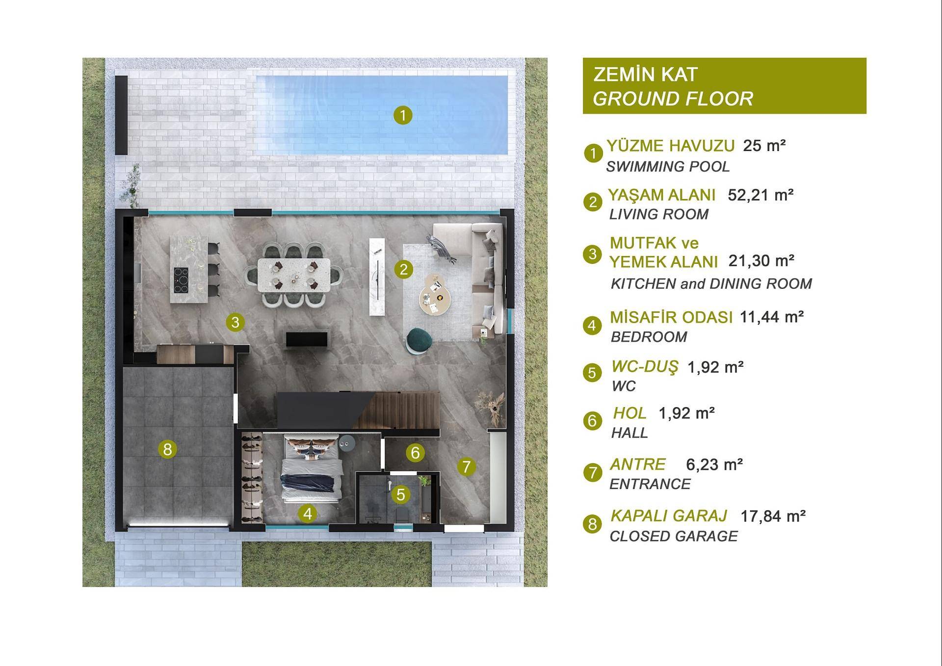 Within this gem of a villa project, there are 21 villas situated on 8000m2 of land. Three types of villas for sale. These are;