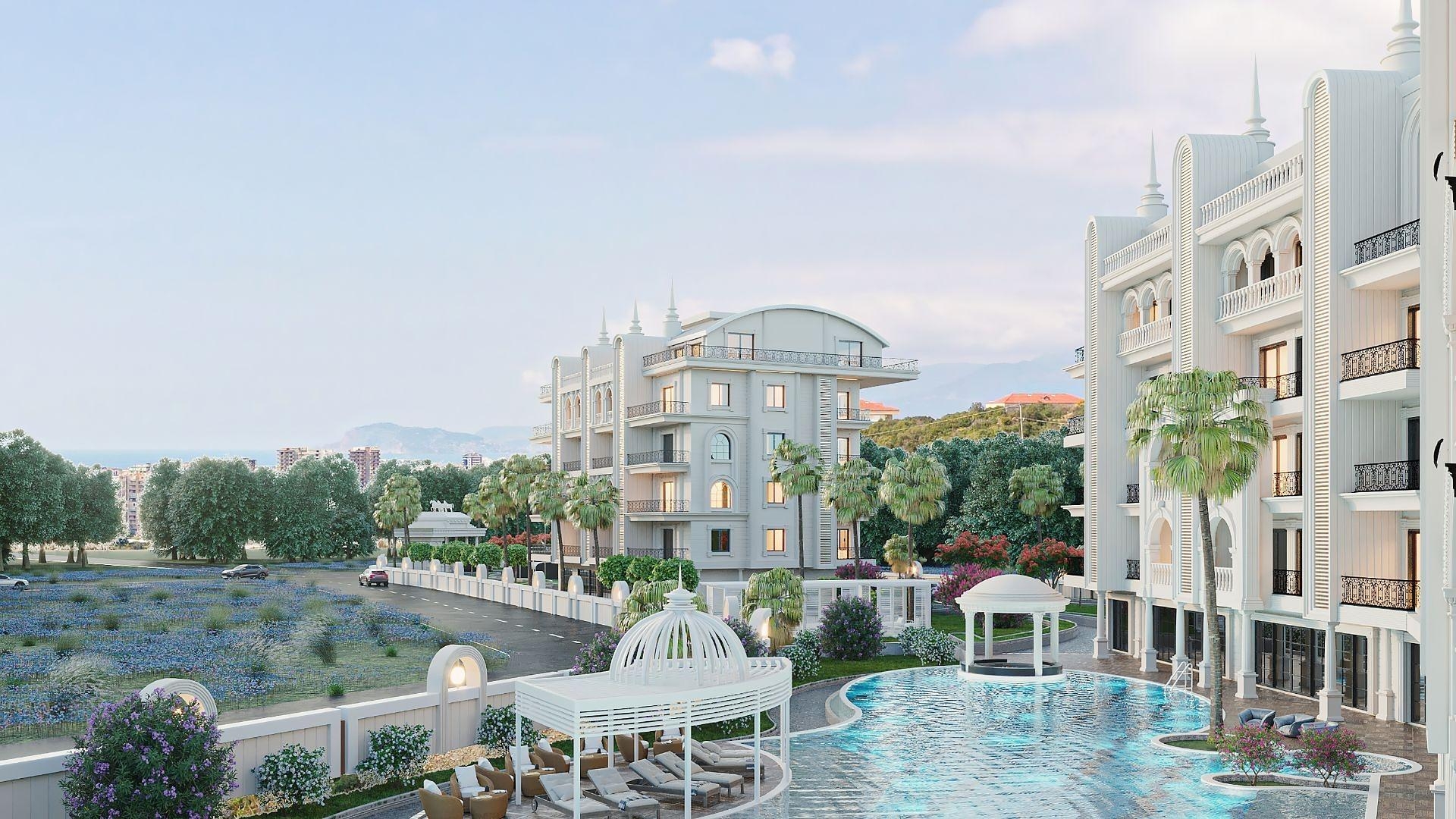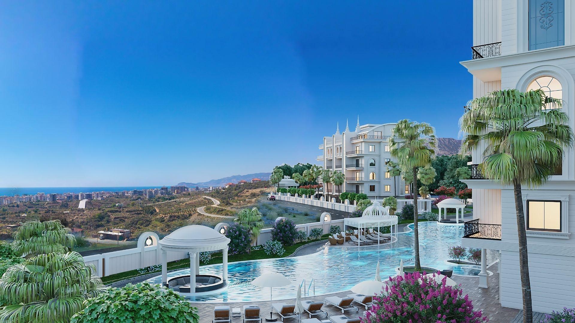 The project is built on a 10.932 m2 plot of land. The complex consists of 5-story buildings with superb apartments ranging in size from 50 to 160 m2 and penthouses on the upper floors. A lovely view from the windows is one of this residential complex's defining qualities. Because the property is situated on a hill, you may enjoy the spectacular sea view and the Taurus Mountains daily. The complex provides all you need: indoor and outdoor pools, a sauna, a Turkish bath, a relaxation area, a BBQ, a jacuzzi, a gazebo, a fish pond, and a garden for walking. There is also entertainment for fun leisure activities such as billiards, table tennis, gym, cinema, basketball court, and tennis court.