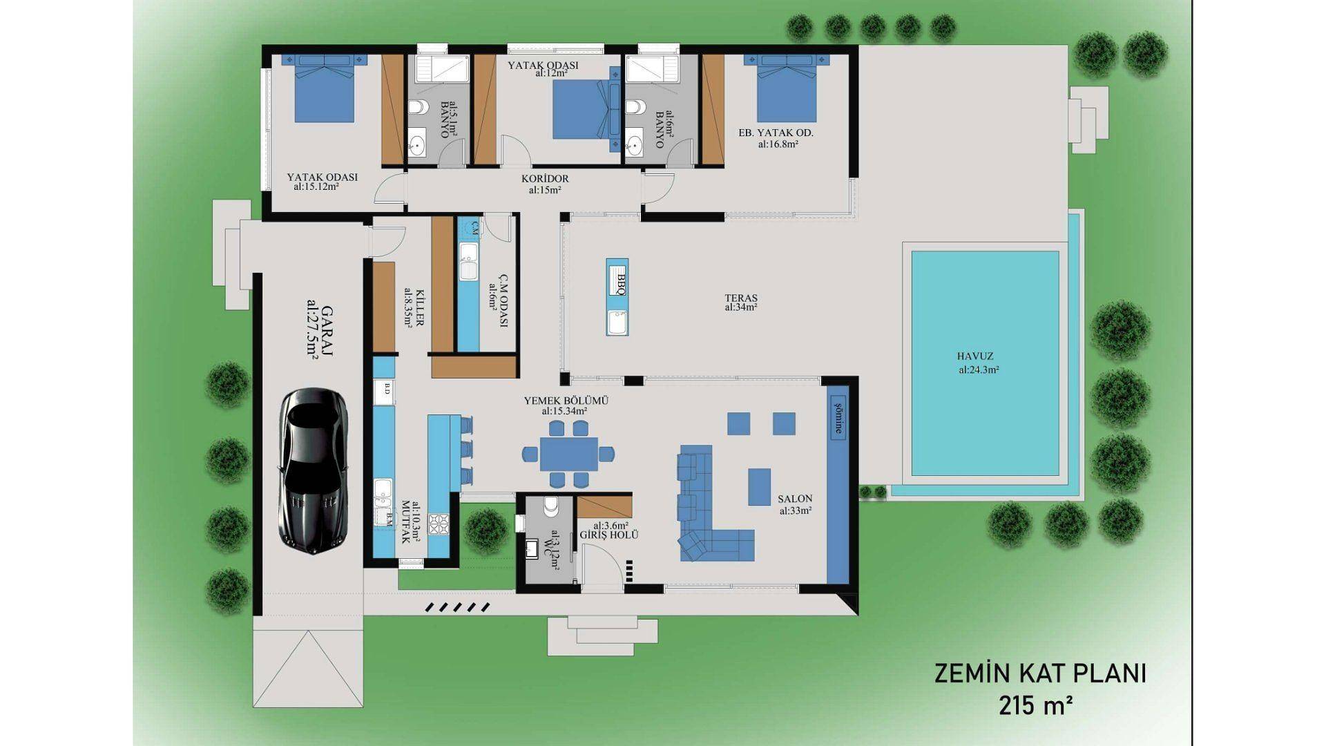 Projekti sisältää 3+1 ylellistä huvilaa. Kaikissa huviloissa on oma puutarha, terassi, uima-allas ja parkkipaikka. Nämä tilavat kodit sopivat perheille, ja niissä on 3 makuuhuonetta ja 2 kylpyhuonetta yhdessä kerroksessa. Yhdistetyn keittiön ja olohuoneen moderni avara järjestely on täynnä luonnonvaloa suurista ikkunoista ja lasiovista. Tämä hanke tarjoaa miellyttävän, rauhallisen, tilavan ja turvallisen elämän kaikille asukkailleen.