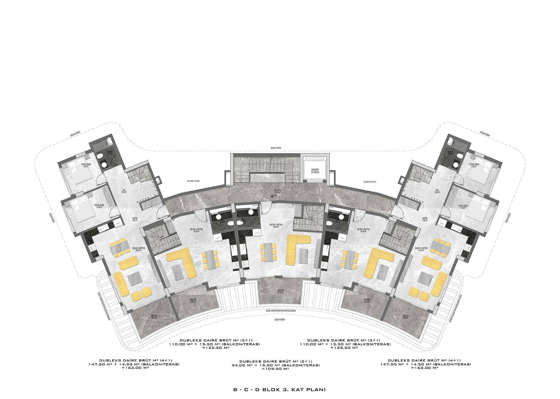 Жоғары стандарттардағы сапа мен дизайн сирек кездеседі, сондықтан осы ерекше 5 қабатты блоктар кешенінде пәтер иелену мүмкіндігін жіберіп алмаңыз. Пәтерлердің өлшемі мен стилі барлығына сәйкес келеді, бөлмеден 5 бөлмелі дуплекстерге дейін пәтерлер бар. Қоршаған табиғи сұлулықтан шабыт алған әдемі жасалған аумақта орналасқан пәтерлер мұхит секілді көрінетін үлкен ашық бассейнді қамтиды. Люкс апартаменттер түйме басқан кезде жайлылық қамтамасыз ететін инновациялық үй технологиясымен жабдықталған. Аланьяда қыс жұмсақ болады, сондықтан көптеген адамдар мұнда өмір сүруді таңдайды. Бірақ салқын күндер туралы еден асты жылыту жүйесімен қамтылған. Нысандар бес жұлдызды сапада және түрік моншасы мен массаж бөлмесін қамтиды.