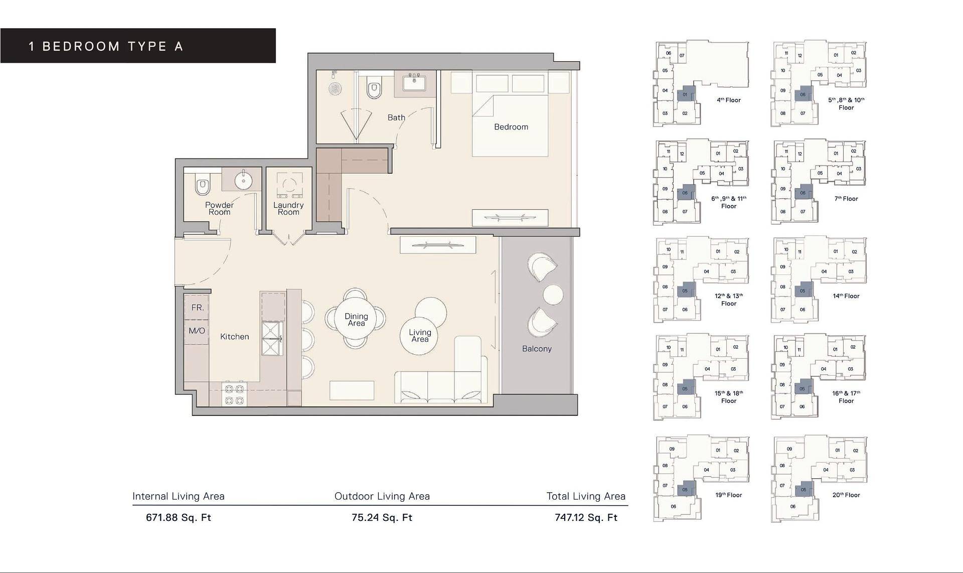 22 қабатты тұрғылықты ғимаратта сатуға арналған бір және екі бөлмелі түрлі люкс пәтерлер бар. Әрбір пәтер дәлдеп ойластырылған және заманауи, мінсіз құрылғылармен және аяндармен жабдықталған. Бұл меншік нысанындағы әрбір бөлік, кең өмір сүретін аймақтардан бастап керемет ерекшеліктерге дейін, жайлылық, әсемдік және құпиялылық қамтамасыз етуге арналған. Осы жоба тұрғындары мүлікте демалыс, ойын-сауық және спорт нысандарына қол жеткізеді, оның ішінде күн шалып жатқан бассейндер, ойын залы, аркада залы, шағын боулинг, теледидар ойын бөлмесі, айналмалы қирату қабырғасы, лобби артындағы жасырын ыңғайлы кітапхана және тағы басқалары бар. Спорт әуесқойлары жоғары деңгейлі фитнес залды, ашық және жабық йога алаңдарын, жүгіру жолдарын, функционалды жаттығу алаңдарын және сауықтыру орталығын ұнататын болады.