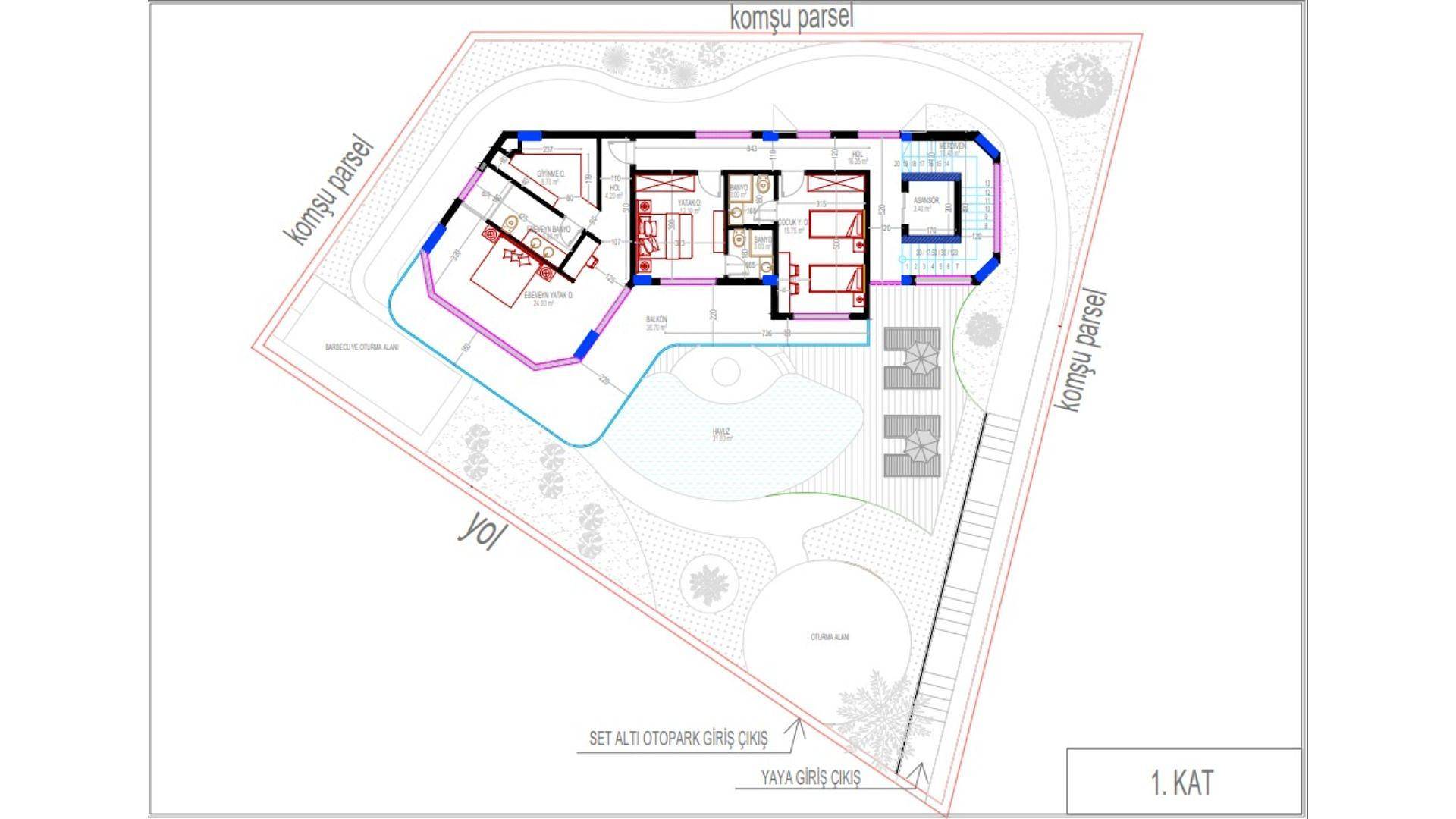 Deze unieke privévilla is gebouwd in het Kargicak-gebied dat bestaat uit 4 verdiepingen, 5 slaapkamers op een totale oppervlakte van 550m2. De begane grond bestaat uit een prachtig gebogen zwembad dat de watervalsfeer bepaalt die uit het balkon stroomt. Dankzij de ruimtes rond het zwembad, zoals de open haard, de buitenbar en de zithoek, is het een uitstekende gelegenheid om tijdens uw verblijf herinneringen op te halen met uw familie en vrienden.