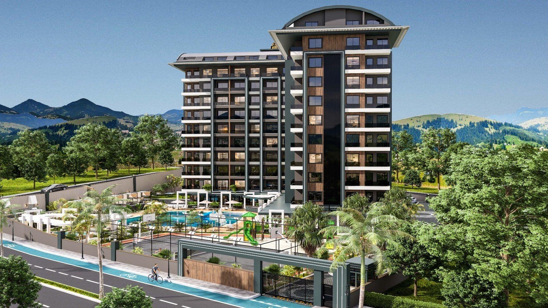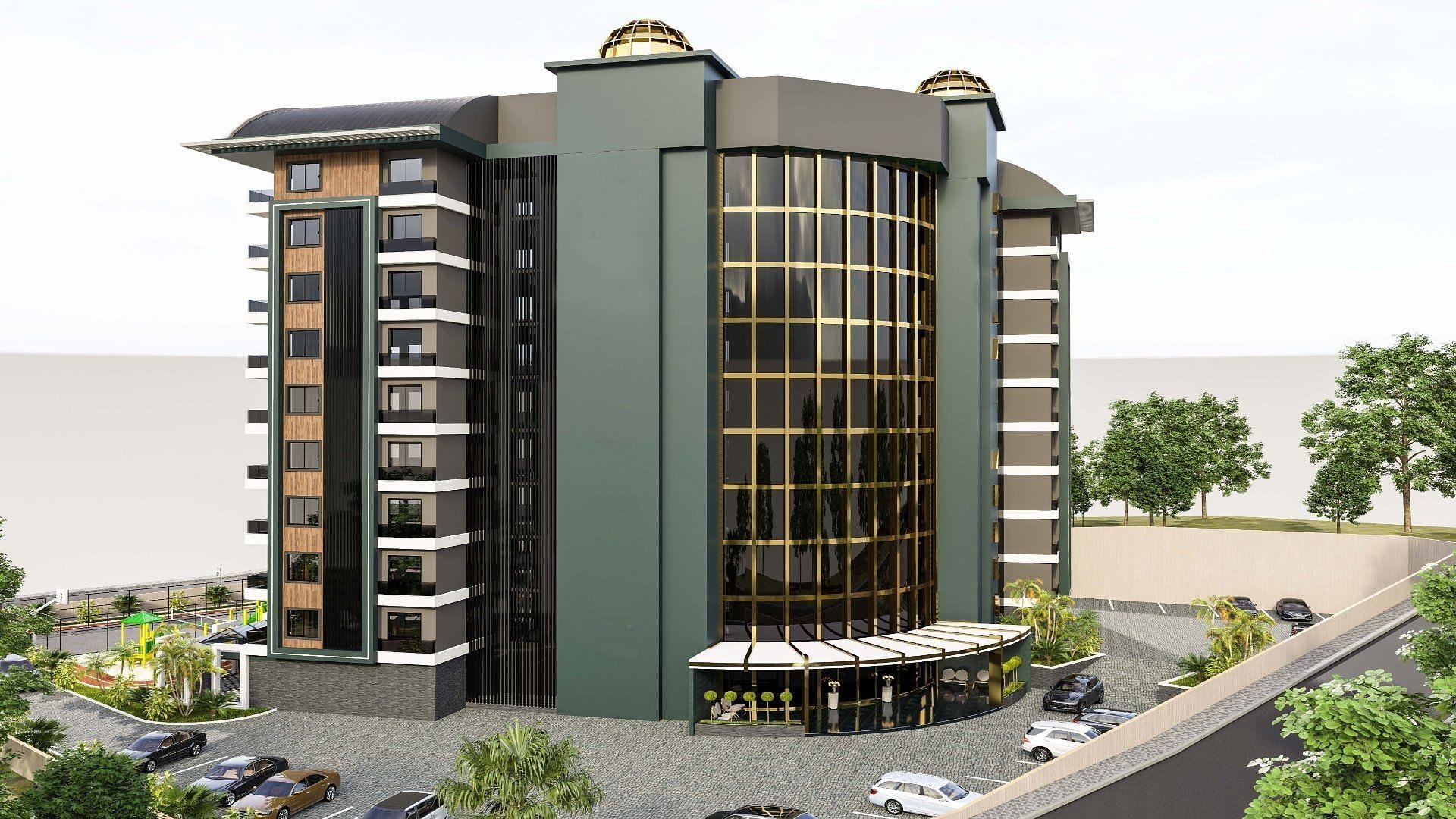 Ett 9-vånings bostadskomplex är byggt på en 5.000 m2 tomt och innehåller 1+1 lägenheter, 2+1 duplex och 3+1 duplex.